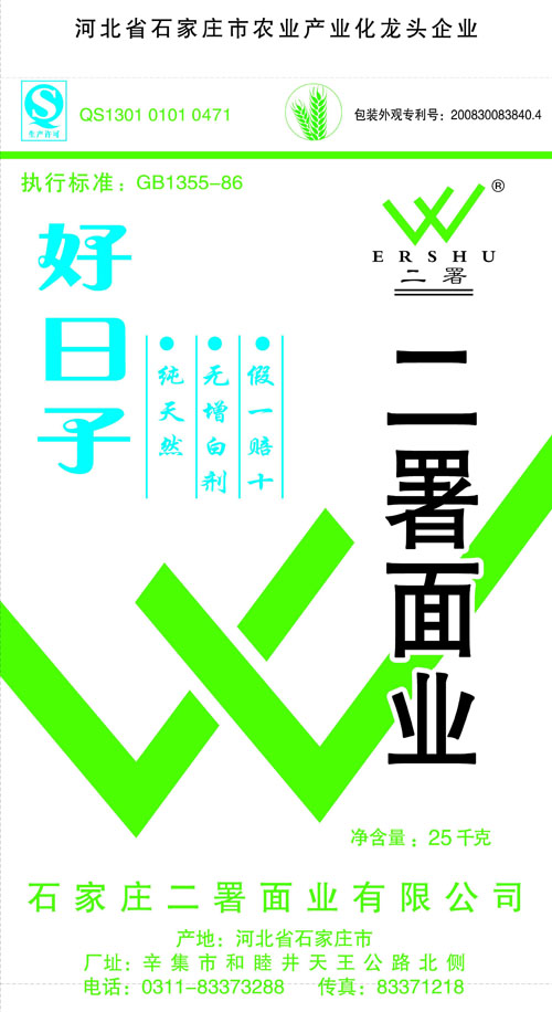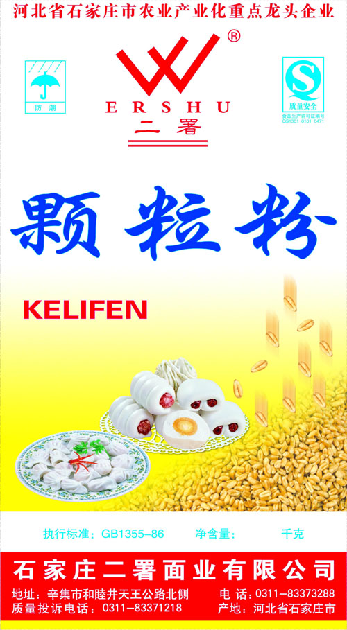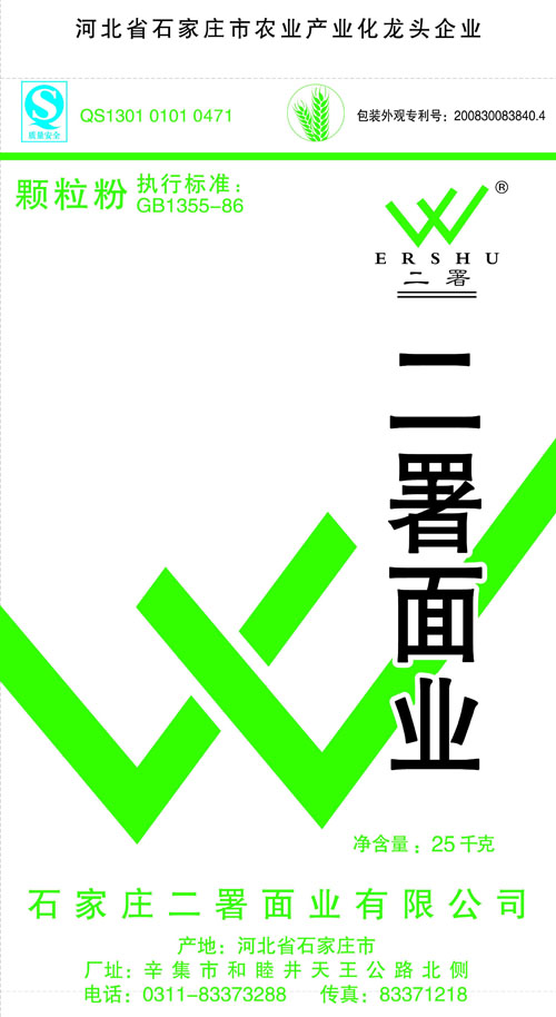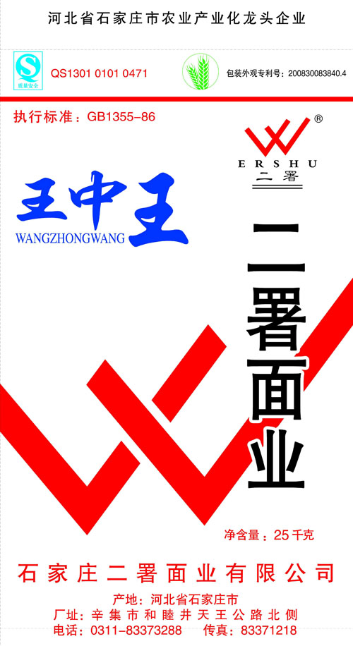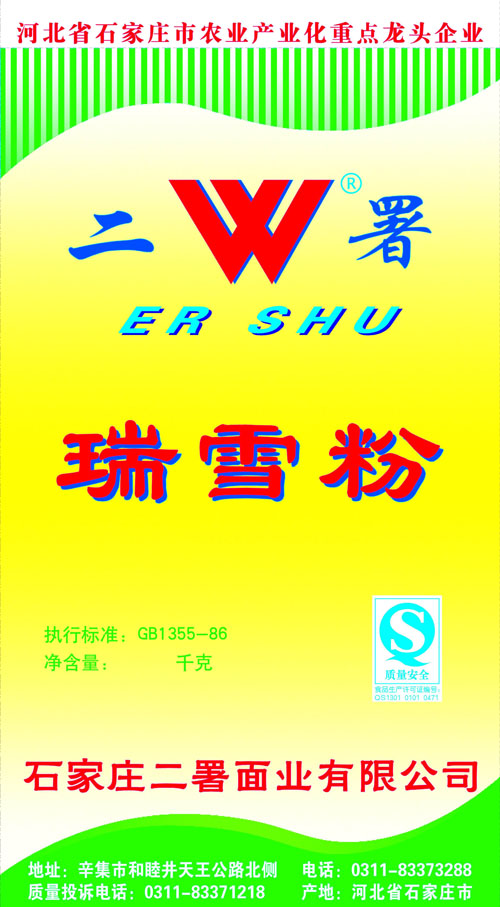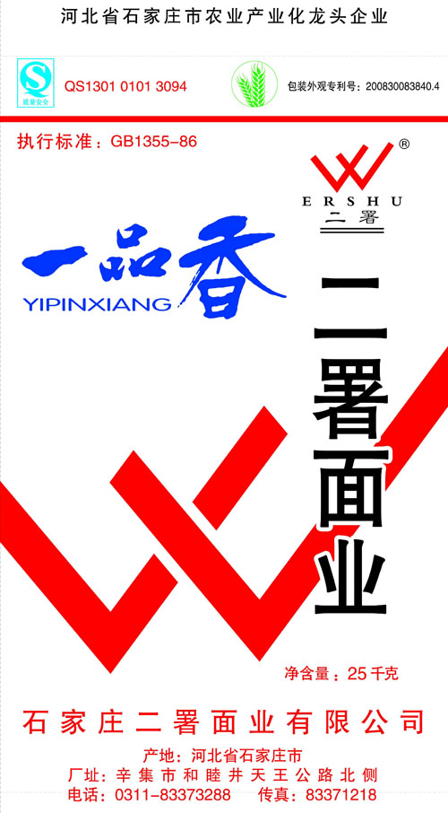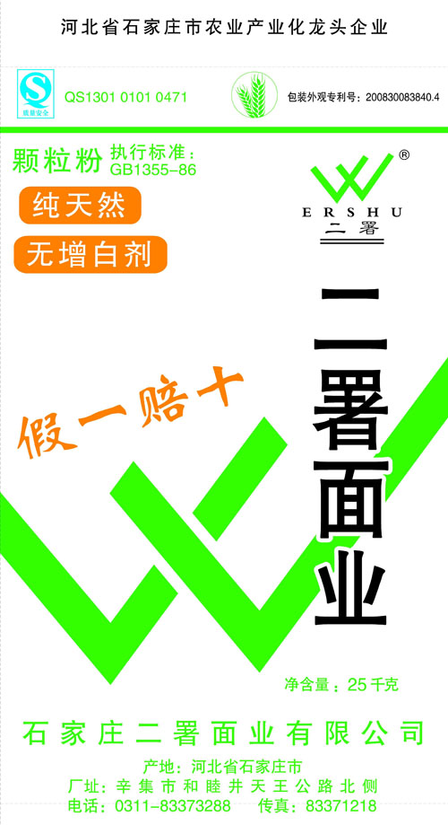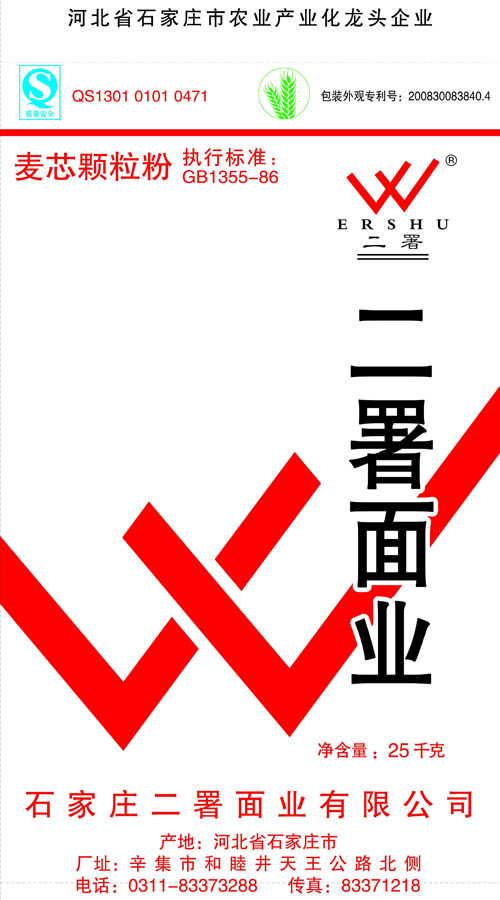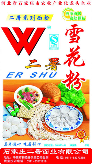 河北面業(yè)         二署面業(yè)有限公司創(chuàng)建于1989年,現(xiàn)已具備日處理小麥300噸的能量,產(chǎn)品質(zhì)量穩(wěn)定,深受客戶青睞。 二署面業(yè)地理位置優(yōu)越,北靠307國(guó)道石黃高速,南鄰石德鐵路,衡井國(guó)道,交通十分方便,為貨物運(yùn)輸提供保證及時(shí)運(yùn)輸?shù)奶烊粭l件。產(chǎn)品運(yùn)銷:黑龍江、吉林、遼寧、河北、內(nèi)蒙、陜西、山西等大中省份,贏得了廣大消費(fèi)者的認(rèn)可。 河北面業(yè)